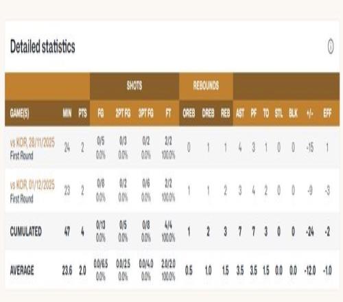 第二场23分钟,8中3,三分6中0,罚球2中2,拿到2分3助攻1篮板2失误,合计13中0,三分8中4,在场-24,胡明轩作为男篮前队长表现非常之差。