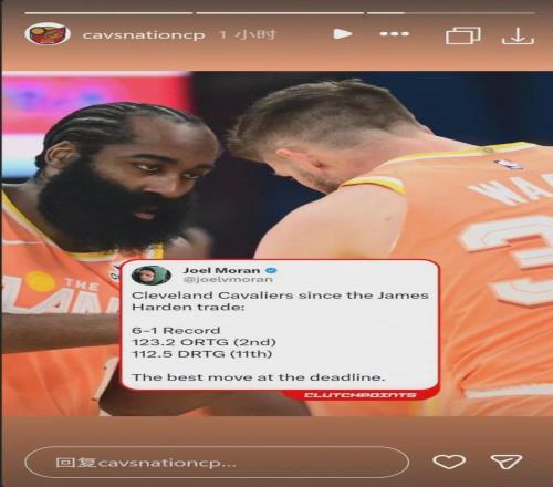 目前为止,哈登为骑士出战七场比赛,场均上阵32.1分钟,贡献18.9分4.6板8助,三项命中率49.4%、48.8%和86.7%,期间球队6胜1负、进攻效率123.2联盟第二,以及防守效率112.5联盟第11,双方的合作被公认为今年交易截止日前的最佳操作。