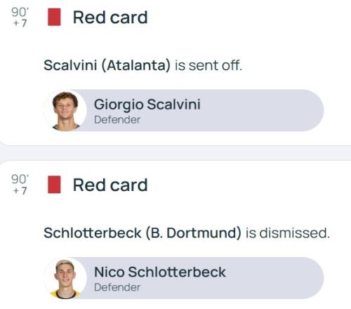 场下的斯卡尔维尼(首发出战被换下)和施洛特贝克(替补未登场)均因为抗议而染红,两人也都将因此停赛。由于多特已经被淘汰,施洛特贝克的停赛将到下赛季执行,而斯卡尔维尼的停赛则会在下一轮对阵阿森纳或者拜仁时执行。