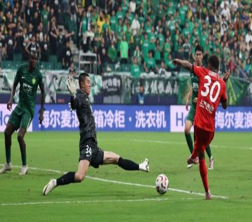 2025年9月21日,上海海港队球员加布里埃尔(中)在比赛中进攻。 当日,在北京工人体育场举行的2025赛季中国足球超级联赛第25轮比赛中,北京国安队主场2比3不敌上海海港队。 新华社记者 胡星宇 摄
